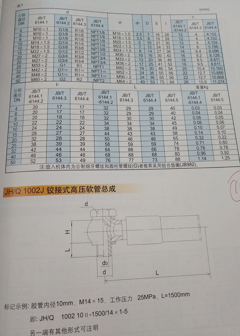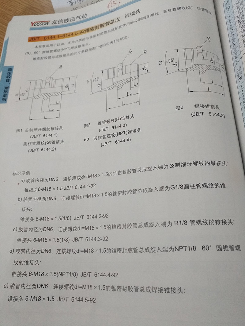 c)膠管內(nèi)徑為DN6,連接螺紋d1=M18*1.5的錐密封膠管總成旋入端為R1/8管螺紋的錐接頭:錐接頭6-M18*1.5(1/8) JB/T  6144.3-92