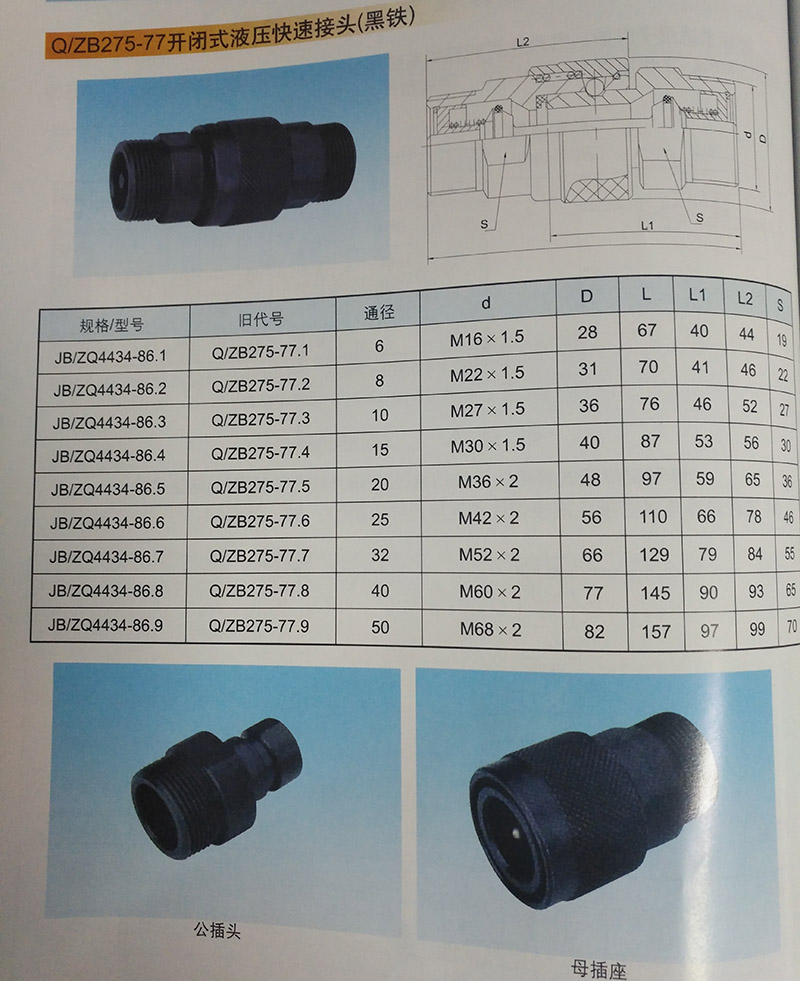Q/ZB275-77開閉式液壓快速接頭(黑鐵): 用途與特點: 本接頭適用于液壓系統(tǒng)中以油為介質(zhì)的場合,公稱壓力為320kgf/c㎡,介質(zhì)溫度為-20°C~+80°C 備注: 該快速接頭共分徑向與軸向密封二中型式,若訂徑向密封,請在型號規(guī)格后加注“徑”字樣。